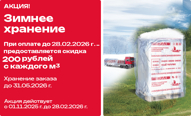 Период проведения акции: с 01 ноября 2025 года по 28 февраля 2026 года Вы можете приобрести газобетонные блоки торговой марки «ГРАС» на выгодных условиях.