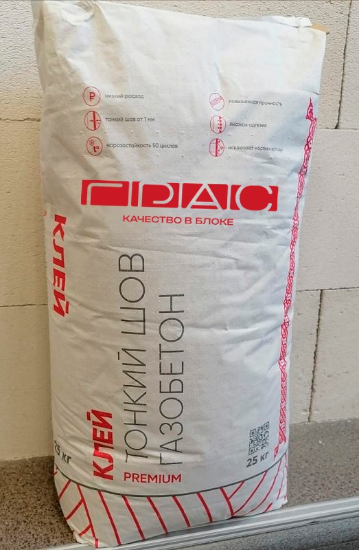 Сухая клеевая смесь для кладки газобетонных блоков «ГРАС PREMIUM», изготовленная на цементно-песчаной основе с использованием специальных химических добавок. Состав выпускается в двух модификациях — летней и зимней. Применяется для укладки блоков и плит из ячеистого бетона, газосиликата и газобетона. Клеевой раствор морозостойкий. Затвердевший раствор обладает высокой адгезией и повышенной прочностью. Продукт экономичный и высококачественный, легко перемешивается и наносится, что делает его выгодным и удобным в употреблении. Соответствует действующим на территории России гигиеническим нормам.