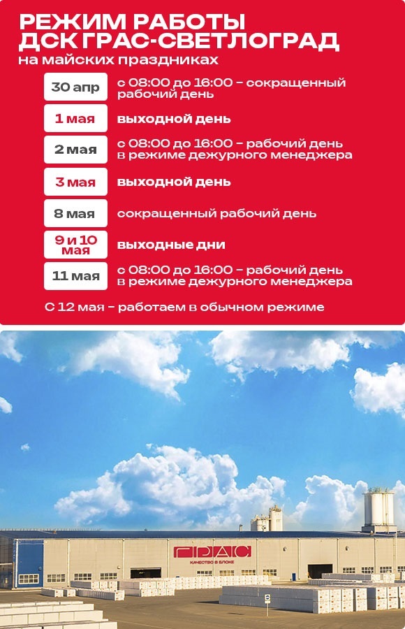 Режим работы отдела продаж «ГРАС» в майские праздничные дни.